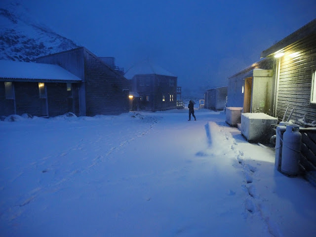 The snow began to fall last night, and did not abate at all throughout the day. We have not had such a sustained fall since we arrived. A pretty white dusting soon turned into a blanket, and by evening, snow drifts almost a metre high had accumulated around the mess.